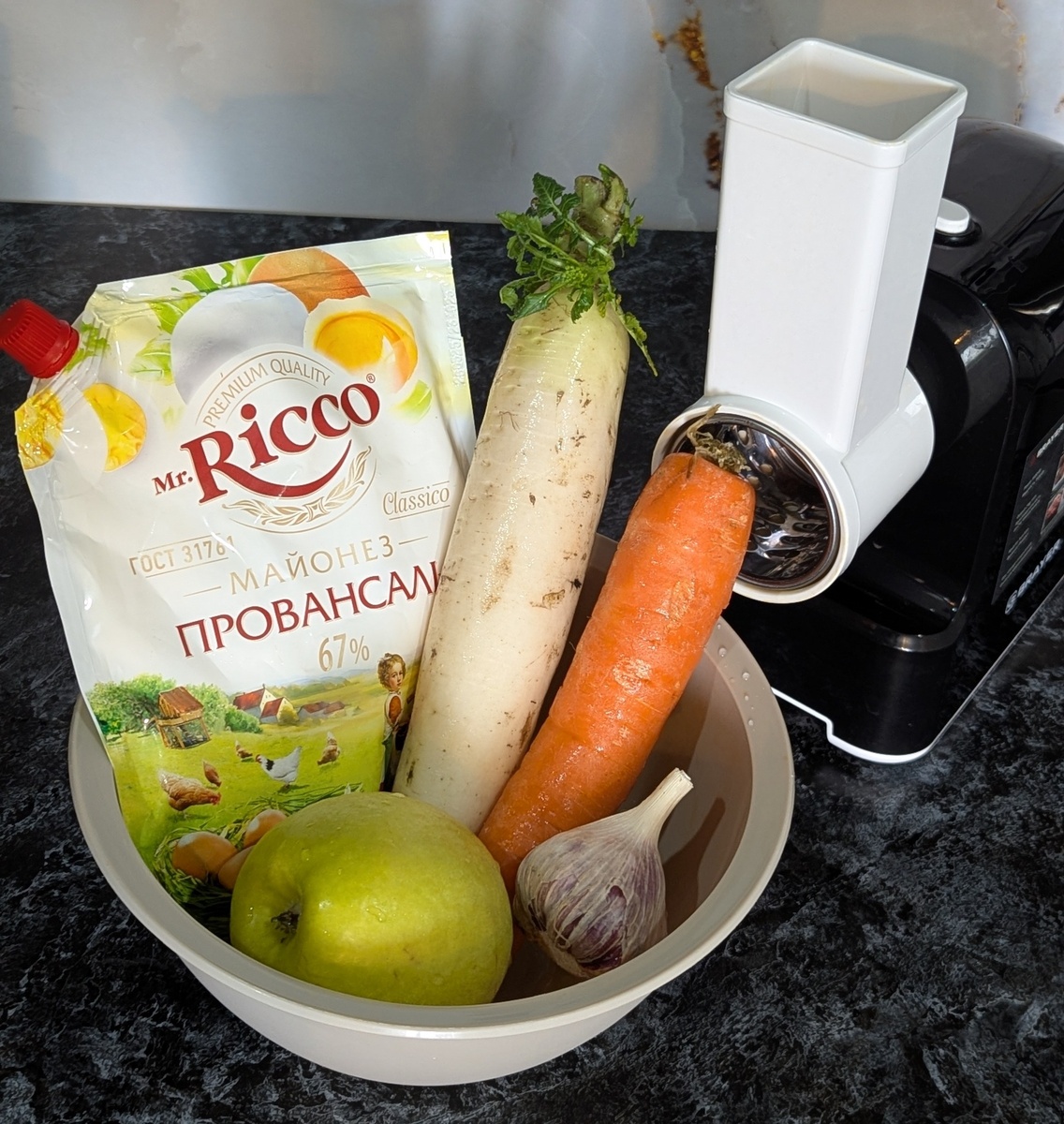 Следующий шаг – натереть яблоко, морковь и редьку на крупной терке. Все ингредиенты смешиваются в одной глубокой миске. Затем добавляют чеснок и заправляют салат майонезом, не забыв посолить по вкусу.