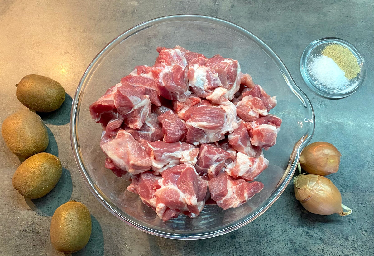 Теперь давайте перейдем к процессу. В глубокую миску выкладываются лук и киви, которые нужно измельчить в однородную массу. Далее, свиную шейку нарезают на кусочки и помещают в ту же миску. Добавьте смесь из киви и лука, посолите и поперчите по вкусу. Перемешать, защипить пленкой и оставить в холодильнике на 4-5 часов, а лучше на целый день — чем дольше маринуется, тем мягче будет мясо.
