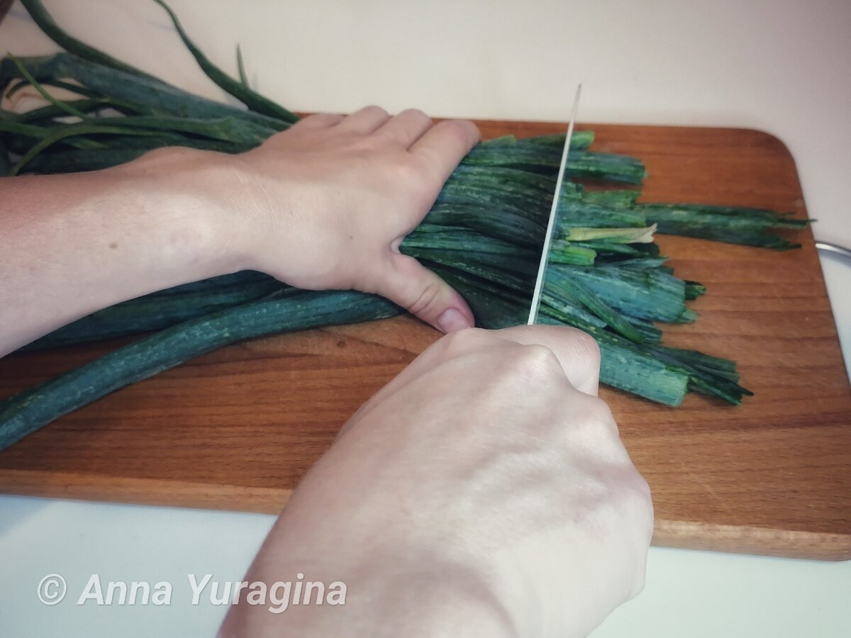 Для начала, необходимо тщательно промыть зелень и дать ей обсохнуть. Затем нарезать лук, убрав засохшие части – оставьте только свежие перья и не трогайте белые части.
