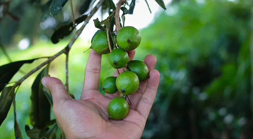 Макадамия, родом из Австралии, сегодня произрастает в разных уголках мира, включая Бразилию и Гавайи. Это уникальное дерево, которое требует много внимания, так как его плоды начинают появляться только через 7 лет после посадки. Из-за сложности выращивания и обработки макадамия считается одним из самых дорогих орехов в мире.