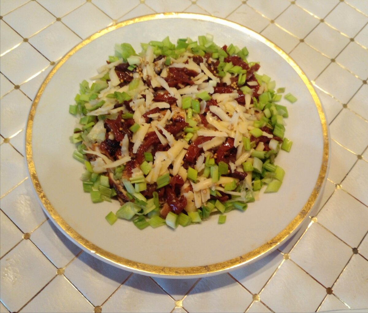 После приготовления курицу следует нарезать на полоски и выложить на тарелку. Сверху размещаются вяленые томаты, а затем тертый сыр, который обеспечит связку ингредиентов. Для завершения блюда можно добавить чайную ложку семян горчицы в оставшееся масло от томатов — это придаст пикантности и хруст.