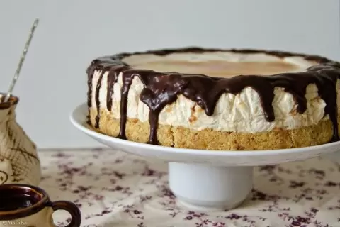Шоколад растапливают на водяной бане и оформляют края потёками, сверху поливают солёной карамелью. Солёную карамель можно сварить по любимому рецепту или использовать готовую. Подача: тонкие срезы с ярким контрастом карамели и шоколада — отличный финал.