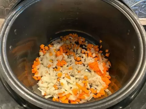 Процесс начинается с нарезки лука и моркови. Их мелко нарезают и выкладывают в чашу мультиварки. Вариант приготовления может быть различным: если требуется более насыщенный вкус, можно обжарить овощи на сливочном масле на режиме «Жарка» до мягкости. Следующим этапом будет нарезка куриного мяса и шампиньонов, которые также помещаются в мультиварку.