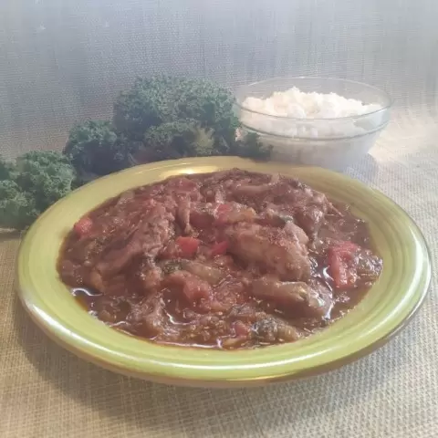 Следующим этапом станет обжарка лука до золотистого цвета с использованием подсолнечного масла. Затем куски курицы поджариваются с обеих сторон, чтобы получить аппетитную корочку. После этого курица отправляется в кастрюлю, которая предназначена для тушения, куда добавляются обжаренные лук и подготовленные томаты.