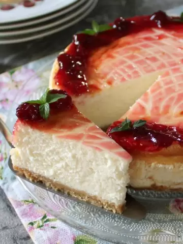 После выпечки дайте чизкейку остыть в духовке, а затем при комнатной температуре. Охлаждение в холодильнике займет минимум два часа (настоящее испытание для терпеливых!). И, наконец, добавьте вишневый джем, сироп или веточки мяты для украшения. Этот чизкейк стал бы идеальным завершающим штрихом любого торжества!