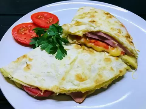 Складываем лаваш пополам и прижимаем его лопаткой. Обжариваем с одной стороны 1-2 минуты, затем переворачиваем и готовим еще пару минут с другой стороны. И вот, завтрак готов! Приятного аппетита!