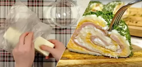 Когда сырная основа будет готова, она аккуратно освобождается от пакета. На сыр выкладываются слои начинки: сначала желтки, затем ветчина и слой белков. С помощью пакета рулет заворачивается, после чего его лучше всего убрать в холодильник, чтобы он хорошо пропитался. Оптимально оставить его на всю ночь. Перед подачей рулет обсыпается зеленью для украшения и нарезается на порционные кусочки, готовые к degustation.