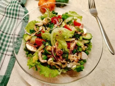 Не забудьте нарезать консервированные кальмары на небольшие кусочки, чтобы они равномерно распределились по салату. В завершение приготовления приготовьте заправку, состоящую из растительного масла, меда, соевого соуса, уксуса и горчицы — о которой можно узнать подробнее, пройдя по специальной ссылке.