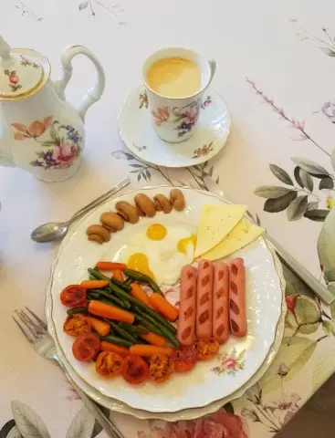 Теперь готовый завтрак можно сервировать. Разрезанные пополам маринованные шампиньоны располагаются на тарелках вместе с сосисками, тушеными овощами, жареными яйцами, помидорами и сыром. Такой уютный, красочный и питательный завтрак станет великолепным началом дня и подарит энергию для предстоящих приключений. Приятного аппетита!