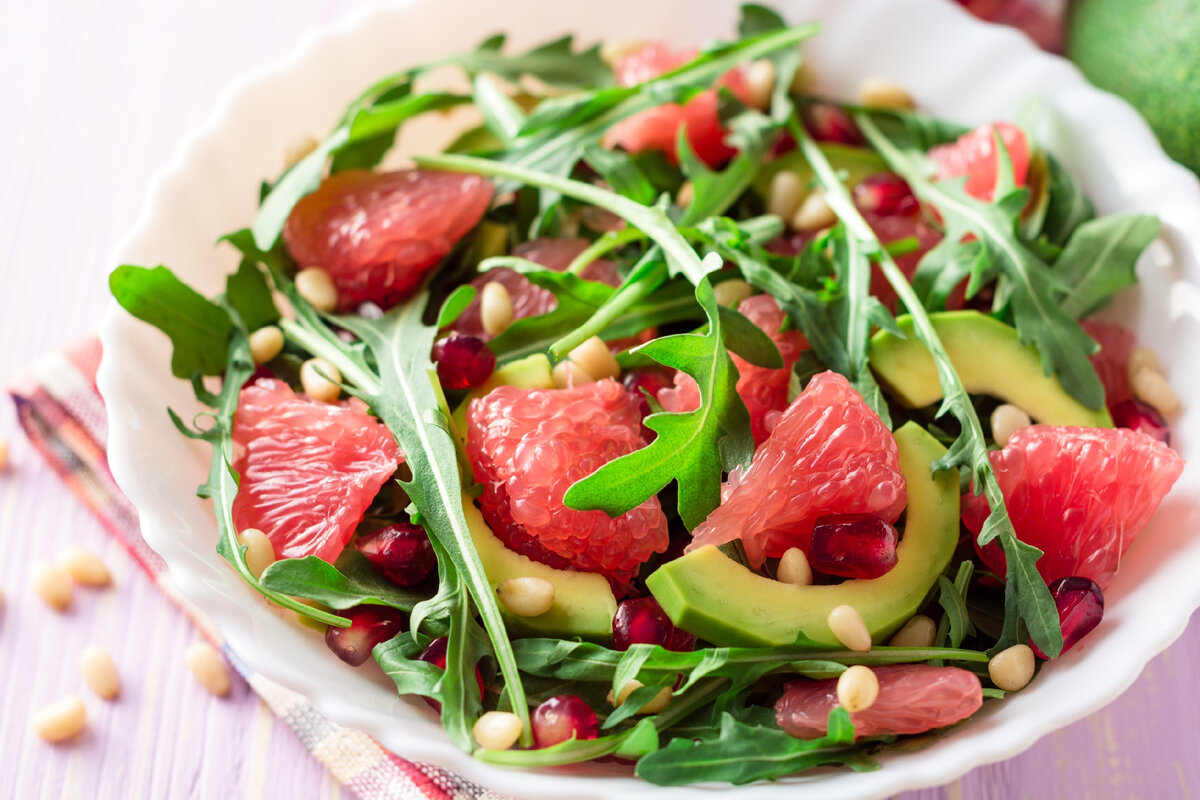 Салат с грейпфрутами, авокадо и орехами — это настоящая витамино-минеральная бомба, благодаря своим составляющим: