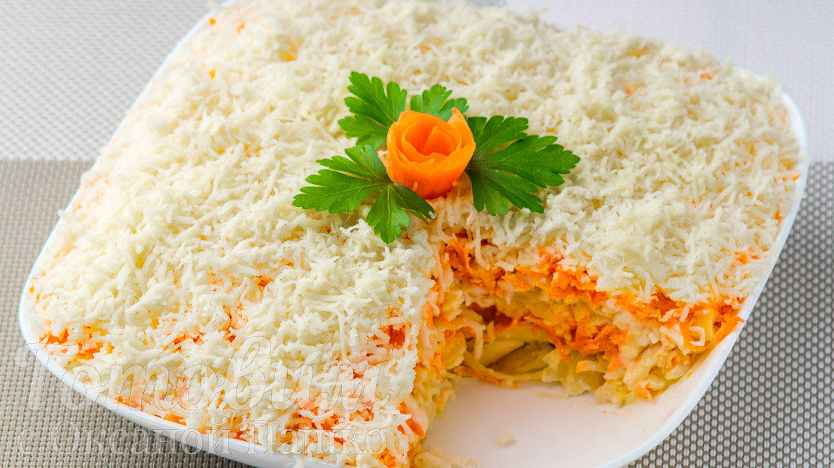 5. Завершите сборку, повторяя слои еще раз, и украсьте верх салата морковным цветком и зеленью петрушки.