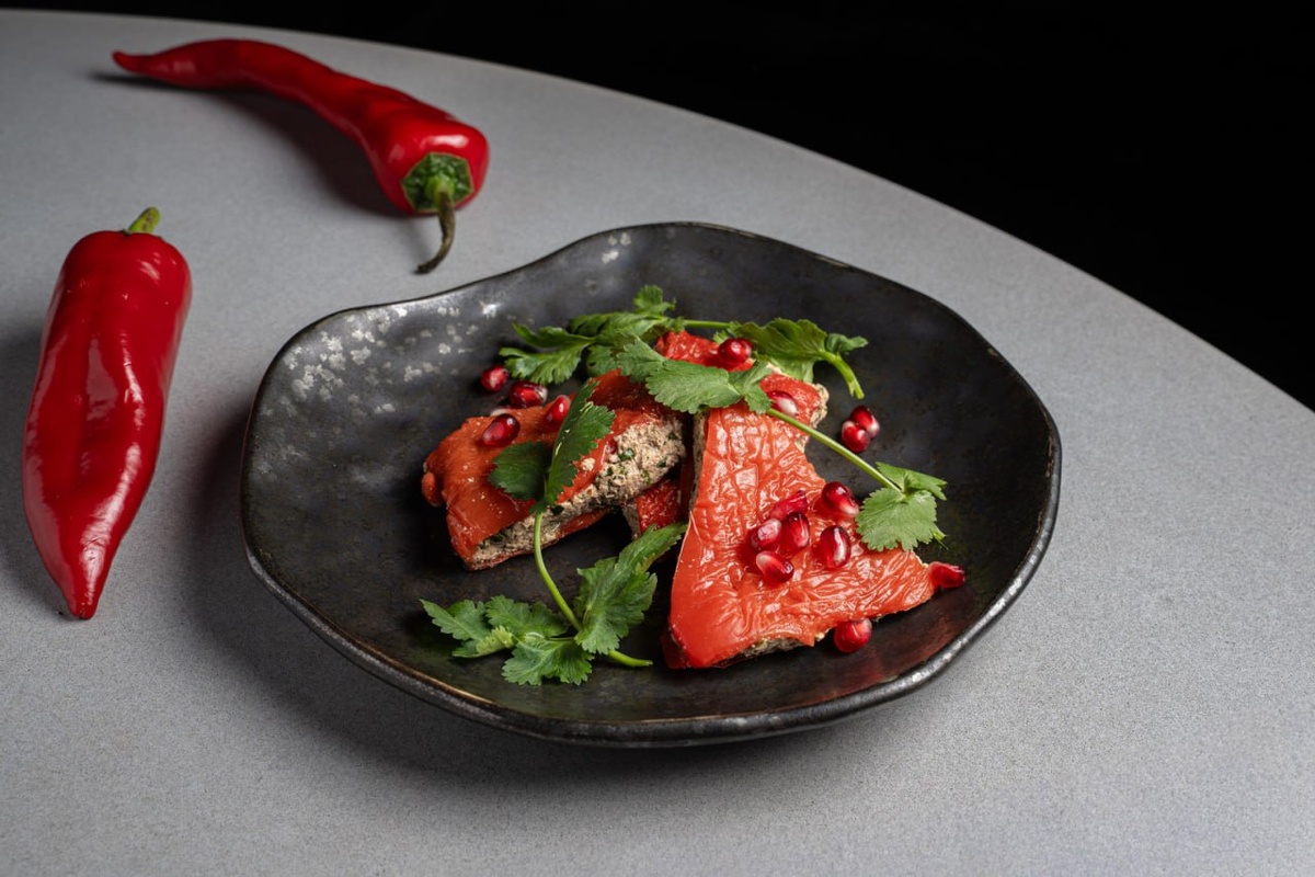 Следующим хитом является перец рамиро с соусом киндзмари. В этом блюде яркий и запоминающийся вкус молекул кинзы гармонично сочетается с чуть кислым уксусом, создавая освежающий эффект. Такой тандем действительно способен взбодрить и сделать вечер незабываемым.