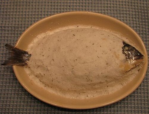 После приготовления рыбу оставляют на несколько минут, а затем разбивают соляную корку. Снимая кожу, можно насладиться невероятно нежным и вкусным блюдом!