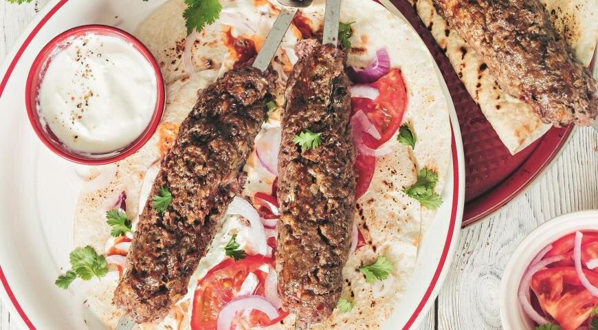 Для подачи, разложите лепешки на блюде и смажьте их острым соусом. В центр каждой лепешки выложите нарезанные помидоры, лук и зелень. Переместите кебабы с шампуров прямо на лепешки, добавляя острый соус и йогурт на гарнир.