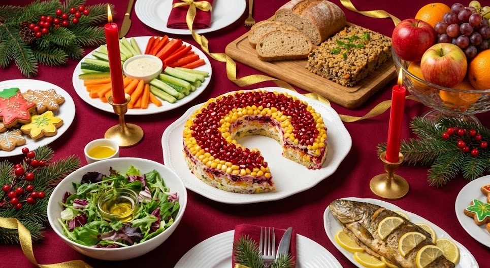 - Изобилие и яркость: Стол должен изобиловать разнообразными яствами, символизируя достаток. Яркая цветовая палитра, в которой преобладают красные, золотые и оранжевые оттенки, привлечет удачу.