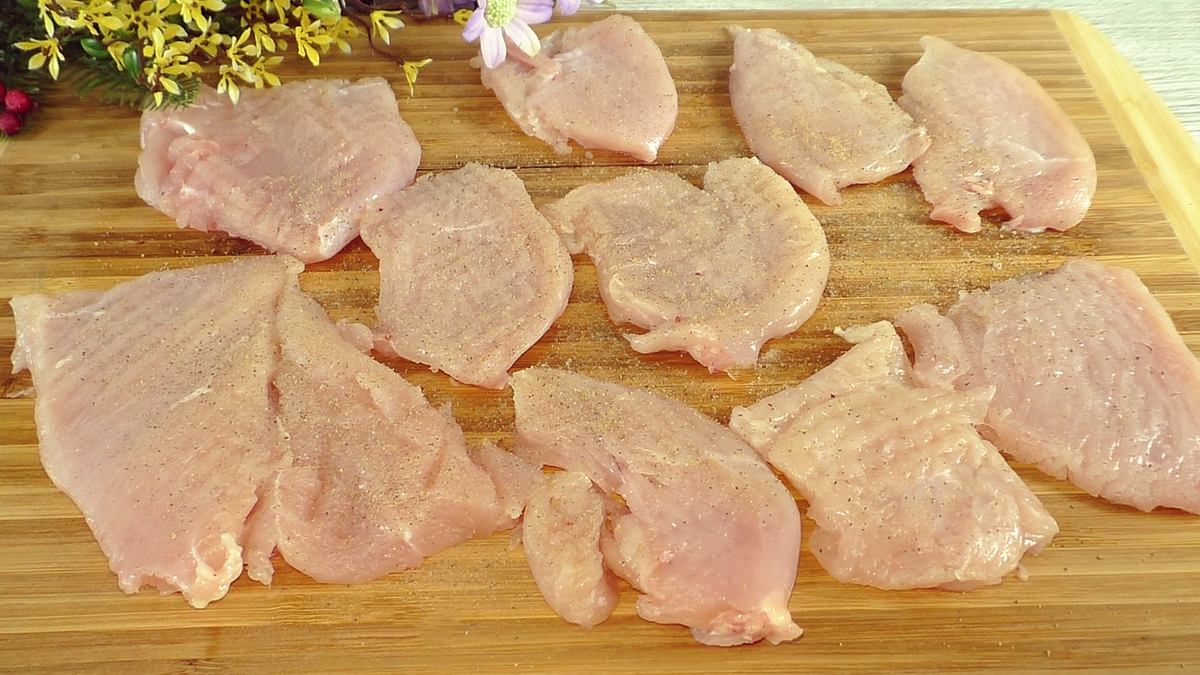 Для начала купленное филе нарезается и слегка отбивается. Мясо приправляется солью и перцем.