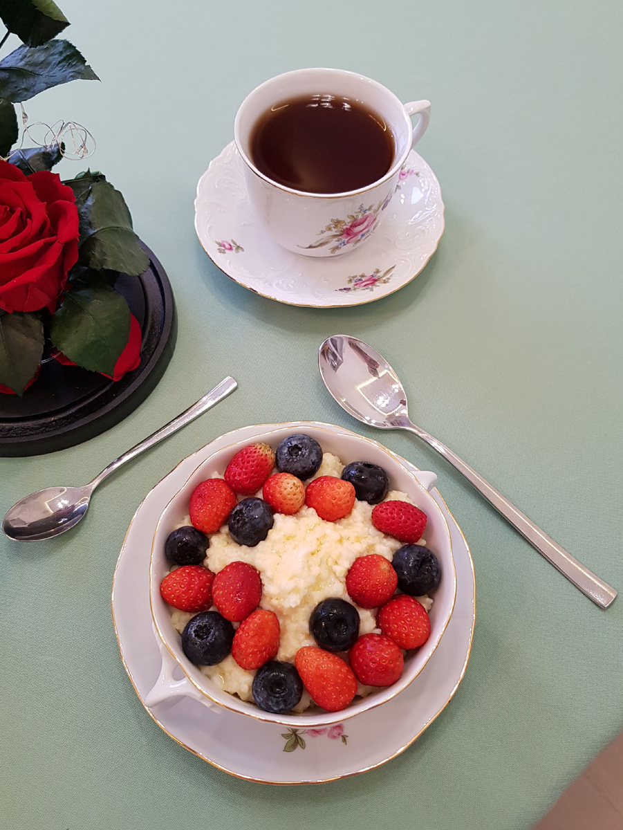 Когда каша будет готова, добавьте сливочное масло, накройте крышкой и дайте настояться пару минут, чтобы масло растаяло. Разложите готовую кашу по тарелкам и украсьте свежими ягодами клубники и голубики.
