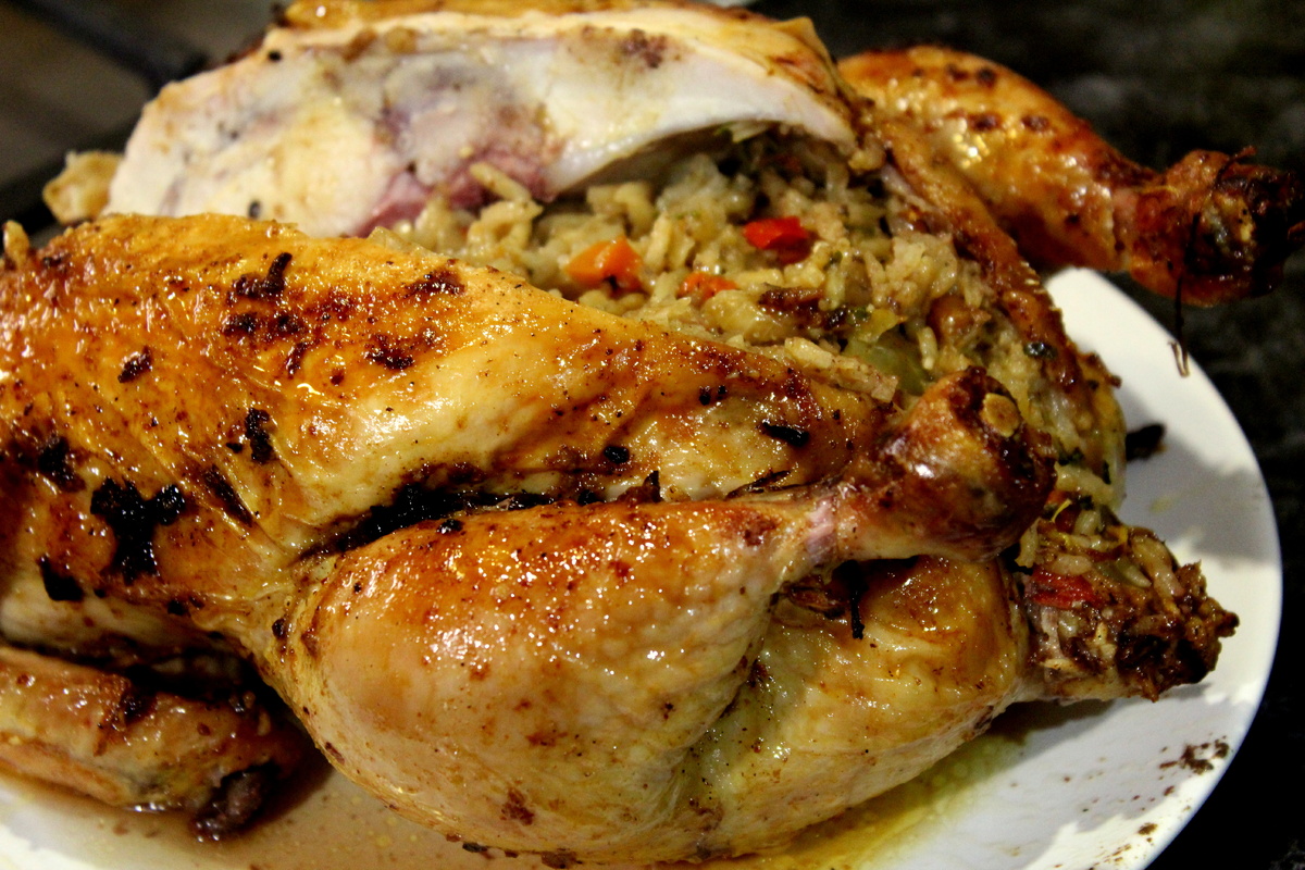 Разогрейте духовку до 220°C, смажьте форму для запекания сливочным маслом. Нафаршируйте курицу рисом, завяжите ножки кухонной нитью и уберите в форму. Уменьшите температуру до 190°C и запекайте около 1 часа 30 минут, периодически поливая выделившимся соком и маринадом каждые 30 минут.