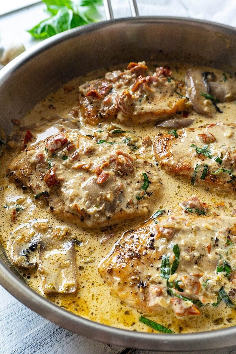 Нежные отбивные из свинины, тушеные в сливочно-грибном соусе