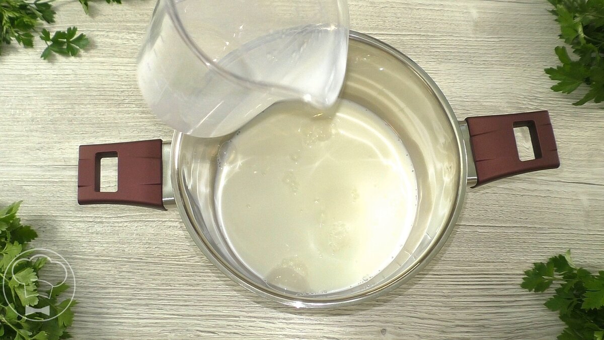 Как только молоко нагреется, отливаем около половины в яичную смесь, продолжая помешивать, чтобы яйца не свернулись. Оставшуюся половину молока вливаем обратно в кастрюлю с заварной основой и ставим на плиту.