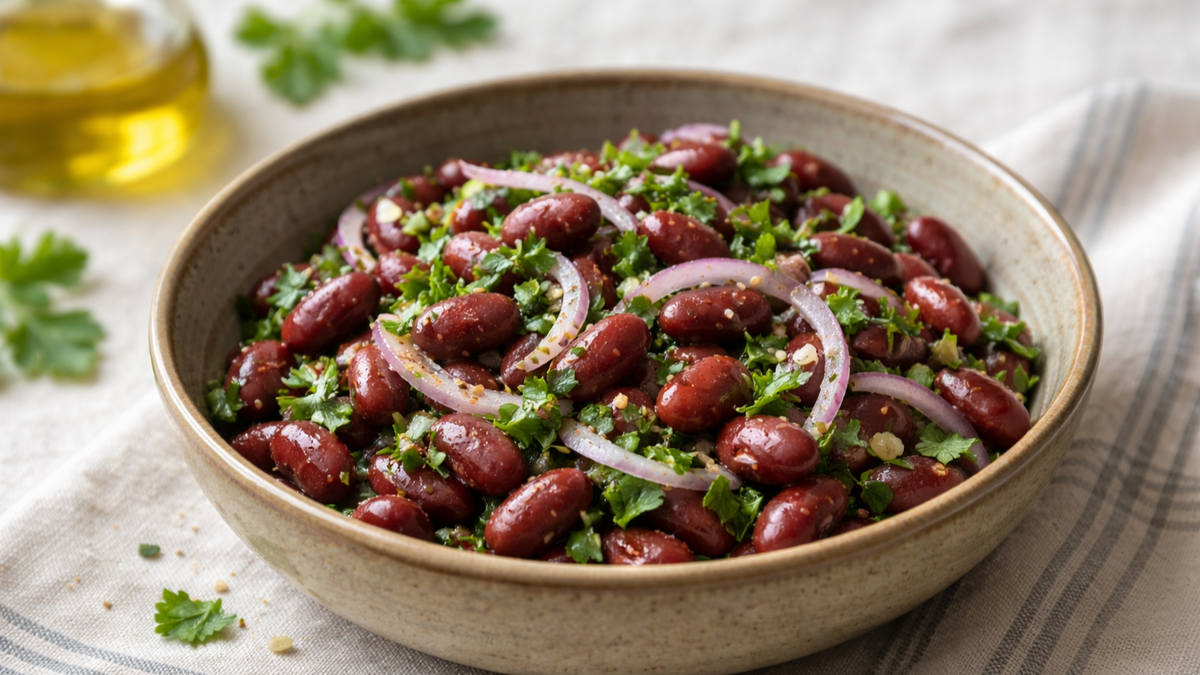 Простой постный салат с фасолью и луком