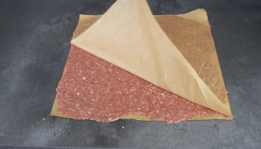 Теперь займитесь фаршем. В миске смешайте фарш, лук, яйцо, соль, перец и, при желании, специи. Тщательно перемешайте массу до однородного состояния, затем отбейте фарш, чтобы улучшить текстуру. Расстелите пергамент и выложите фарш, раскатайте в прямоугольный пласт равномерной толщины.