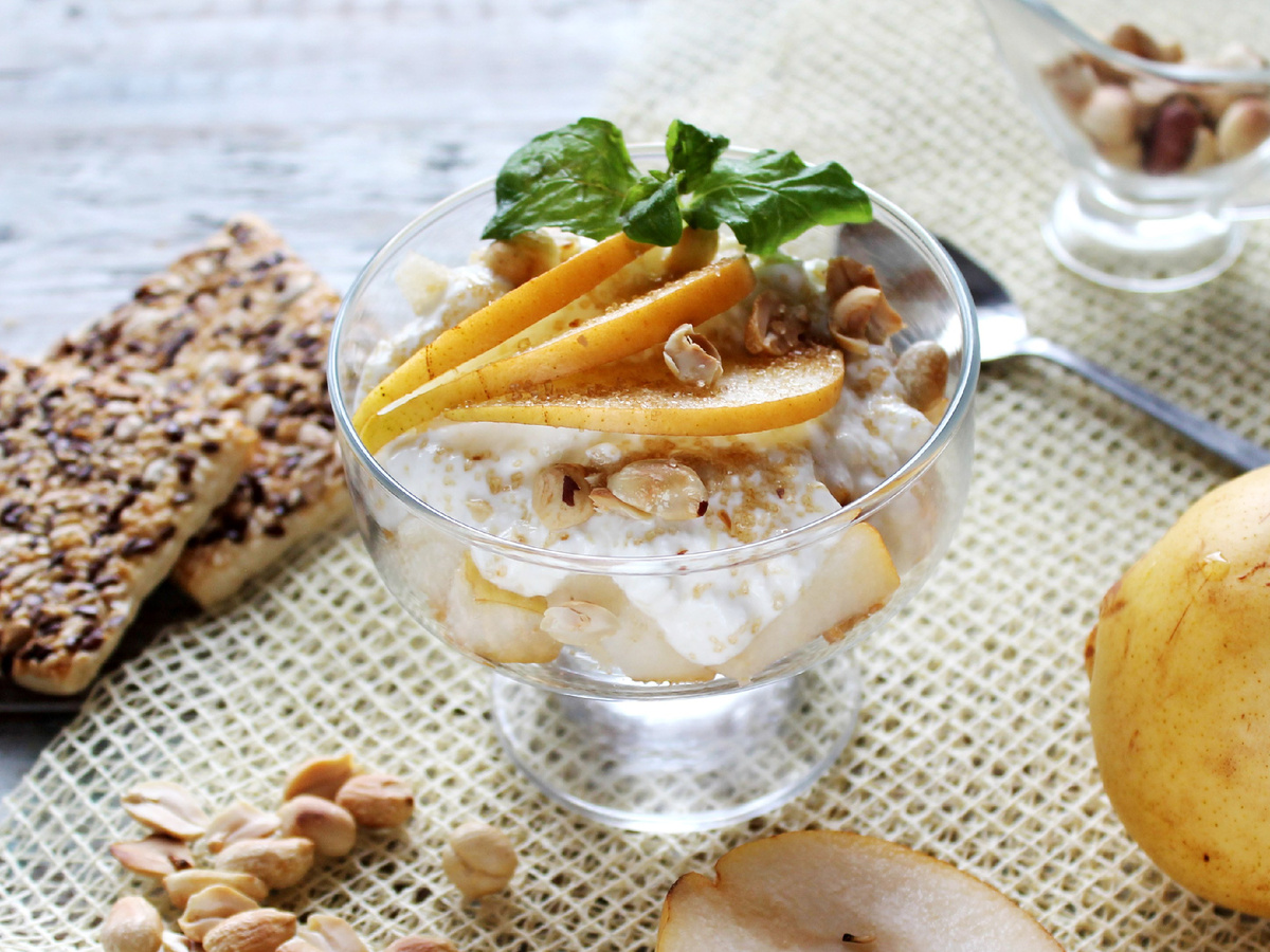 Этот десерт — отличное доказательство того, как из обыденных ингредиентов можно создать нечто удивительное. По предложенному рецепту получается аппетитное порционное угощение, которое можно собрать всего за несколько минут. Нежные кусочки груши в сочетании с поджаренными орехами придают ему невероятную текстуру и приятный вкус!