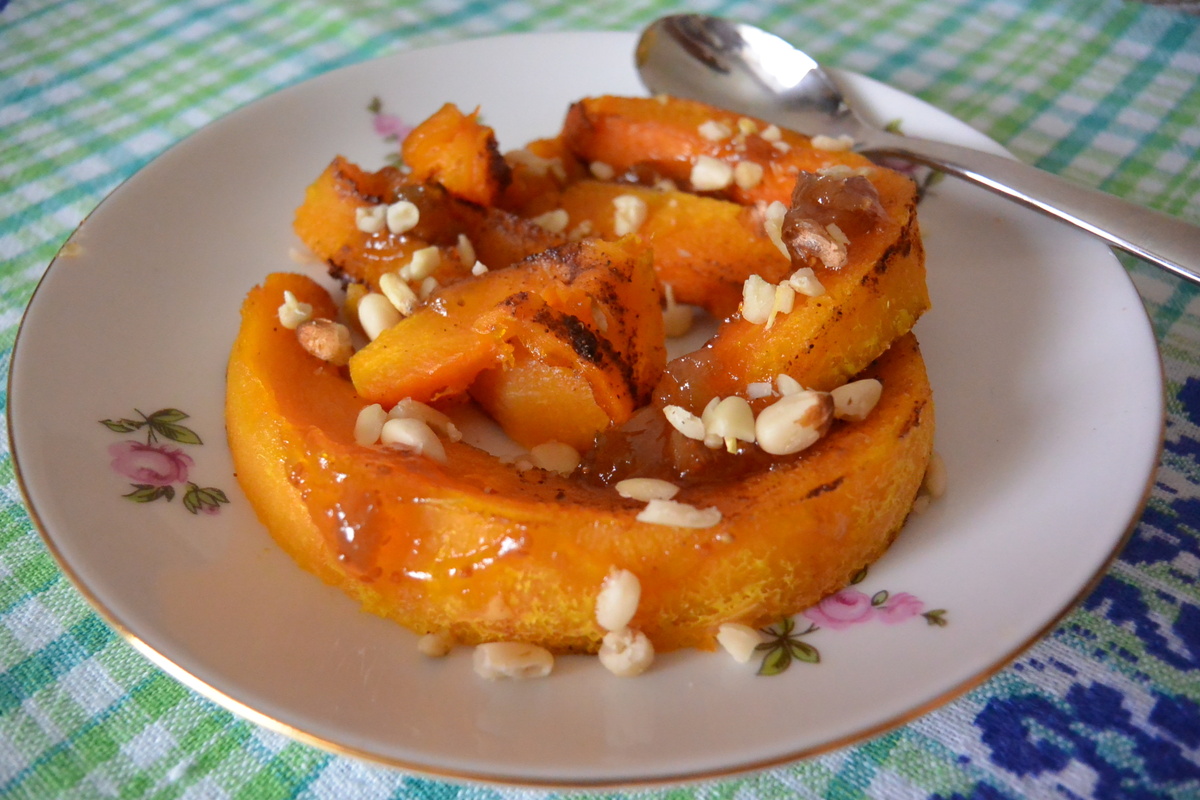 Перед подачей посыпьте готовую тыкву кедровыми орехами. Если хотите добавить немного сладости, полейте лакомство вареньем или медом. И вот, ваше изумительное угощение готово! Приятного аппетита!