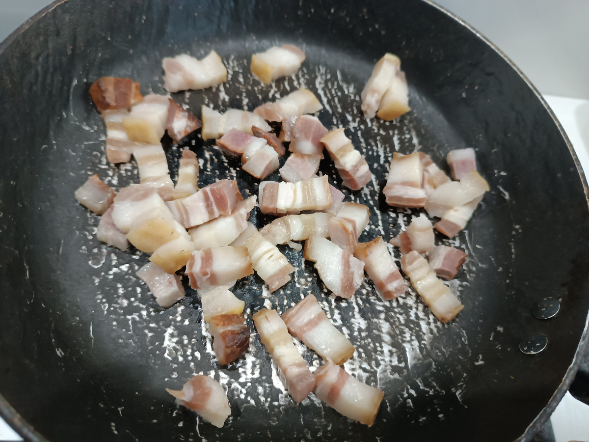 Первым делом сало нарезается на небольшие кусочки и обжаривается на разогретой сковороде. Если ваше сало не слишком жирное, добавьте немного растительного масла. После обжаривания сало выложите в отдельную посуду.