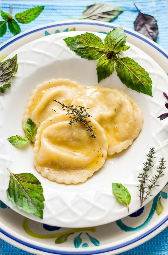 С помощью формочки для печенья вырежьте равиоли, стараясь сохранить начинку в центре. Чтобы избежать ее утечки, тщательно проверьте края.
