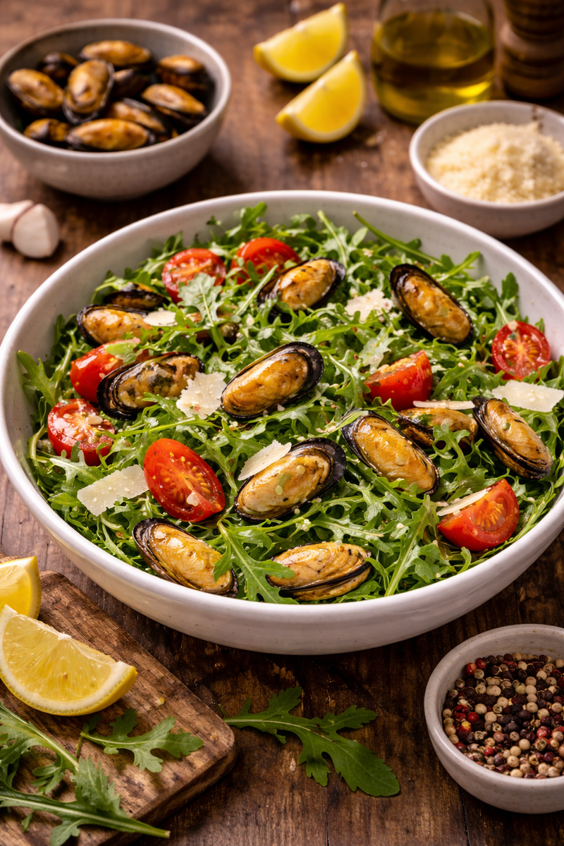 Мидии привносят в блюдо глубину морского вкуса, тогда как рукола радует свежестью и легкой горчинкой. Заправка объединяет все элементы в гармоничную симфонию, подчеркивая, а не перебивая общий вкус. Этот салат не прячется за основным блюдом, но при этом легко становится его центром.