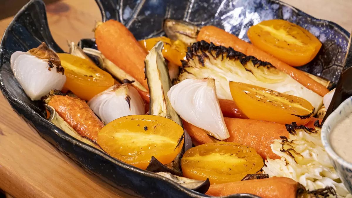 Пока морковь запекается, переходите к остальным овощам: баклажаны нарезайте вдоль, а капусту — на крупные куски. Лук тоже нарежьте крупно. Выложите все на второй противень, приправьте и полейте маслом, отправив запекаться на 20 минут.
