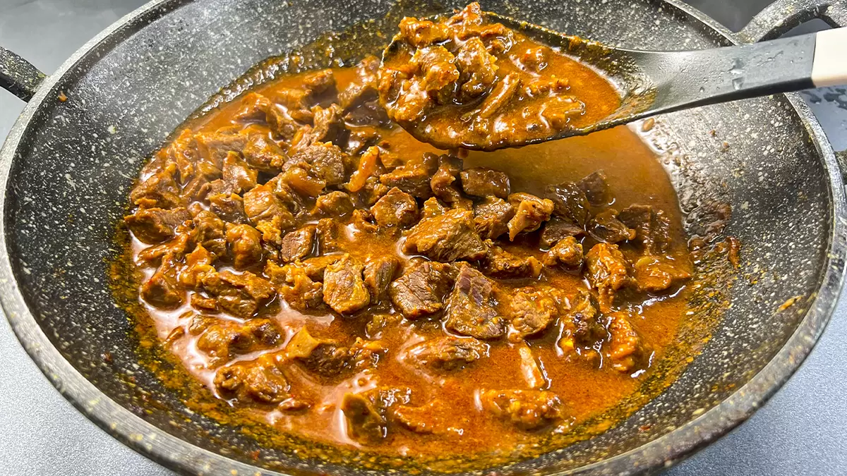 3. Как только лук станет румяным, добавляется говядина. Готовить на среднем огне, периодически помешивая. Свежезажаренное мясо выделяет сок, который делает тушение более ароматным.