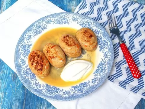 Шаг 4: Все составляющие – овощи, фарш, яйца и рис – соединить в одной миске, добавить соль и перец по вкусу. Сформируйте из массы небольшие голубцы, обжарьте их в сковороде до золотистого цвета, затем влейте куриный бульон и тушите под крышкой 9-12 минут. Подавать горячими со сметаной – это придаст блюду невероятную нежность и сделает вкус еще более насыщенным.