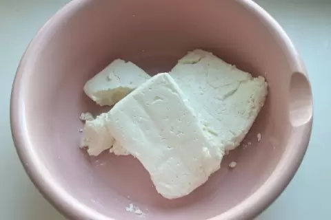2. В глубокой миске тщательно перемешайте творог с молоком или сливками, используя лопатку или блендер до получения однородной массы.