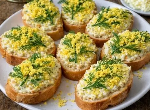 Готовую начинку равномерно распределить по ломтикам обжаренного хлеба. Разложить бутерброды на красивом блюде, посыпать сверху натертым желтком и украсить свежими веточками укропа.