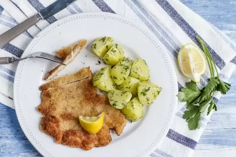 Пока шницель жарится, мелко нарезать укроп, петрушку и чеснок. После варки картофеля, смешать его со сливочным маслом и зеленью. На тарелке разместите шницель и картофель с зеленью, сбрызните лимонным соком по вкусу. Блюдо готово к подаче!