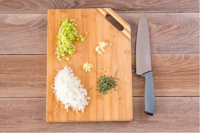 Шаг 1: Начать следует с подготовки ингредиентов. Лук очищают и нарезают мелким кубиком. Свежие листочки розмарина отделяются от стеблей и мелко нарубаются. Чеснок следует раздавить и также мелко нарезать. Имбирь чистят, половину нарезают, и если нравится острота — можно добавить больше. Стебель сельдерея нарезается кубиками размером 5х5 мм.