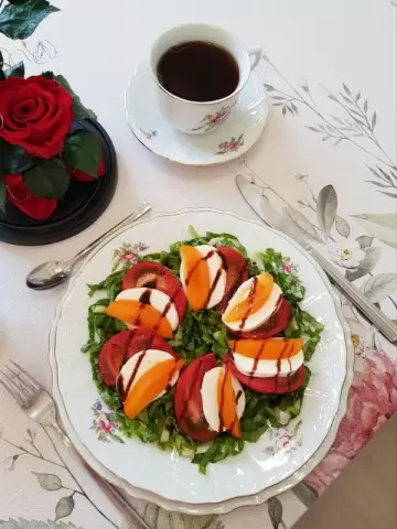 Этот вкусный и легкий салат идеально подойдет для вечернего ужина, сочетая в себе свежесть салата ромен и неповторимый вкус моцареллы.