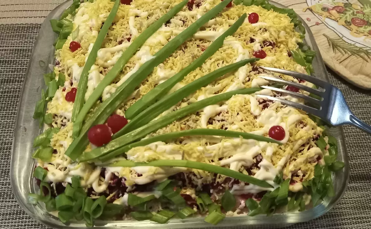 Таким образом, традиционный салат «Селедка под шубой» переосмысляется в интересное, яркое блюдо, которое привлечет внимание на праздничном столе и порадует взгляд и вкус.