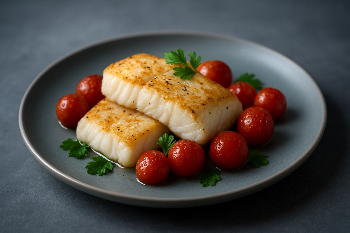 Духовку разогреть до 200°C. Филе промокнуть, слегка приправить лимонным соком, измельченным чесноком и травами. Выложить в форму для запекания, добавить помидоры черри и полить маслом. Запекать 12-15 минут, пока рыба не станет непрозрачной и легко расслаивается. Перед подачей рекомендуется дать блюду немного остыть и полить образовавшимся соком.
