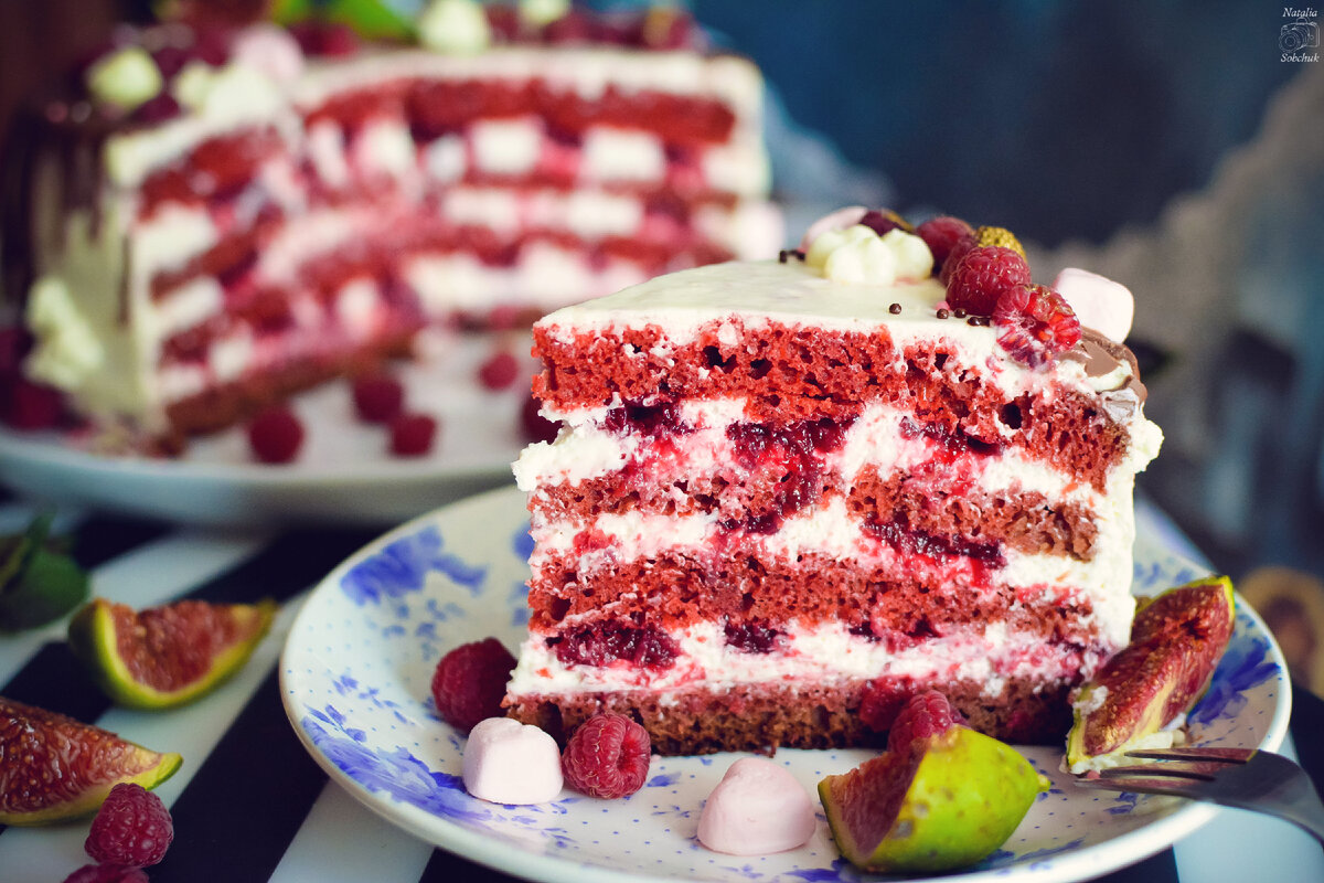 Теперь вы готовы собрать торт: чередуйте слой бисквита, крема и вишнёвого конфитюра. Украсьте на своё усмотрение и порадуйте своих близких этим невероятным десертом!